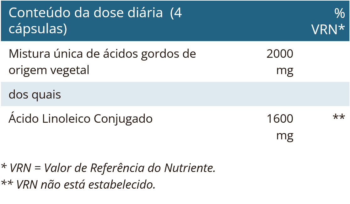 dos quais, Ácido Linoleico Conjugado (CLA) 400 mg (Óleo de cártamo contendo no mínimo 80% de Ácido Linoleico Conjugado (CLA))