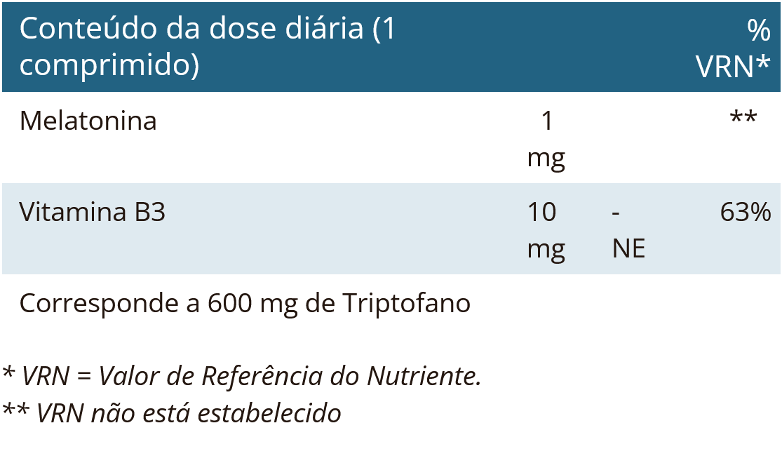 Agente de volume: celulose microcristalina; ácido nicotínico; agente de endurecimento: dióxido de silício; estabilizador: carboximetilcelulose de sódio reticulada; antiaglomerante: maltodextrina; melatonina; agente de revestimento: hidroxipropilmetilcelulose; antiaglomerante: sais de magnésio de ácidos gordos.