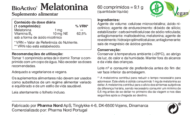 BioActivo® Melatonina contém 1 mg de melatonina, uma substância produzida pelo corpo humano, que contribui para reduzir o tempo necessário para adormecer e para o alívio dos sintomas subjetivos da diferença horária.