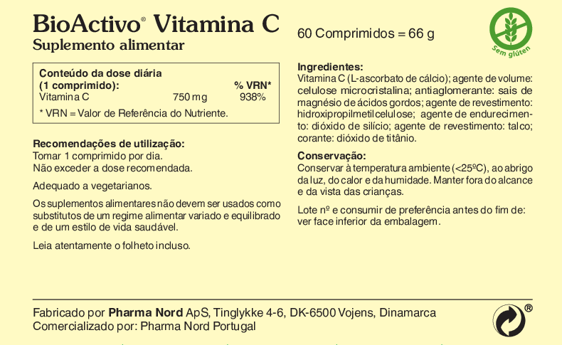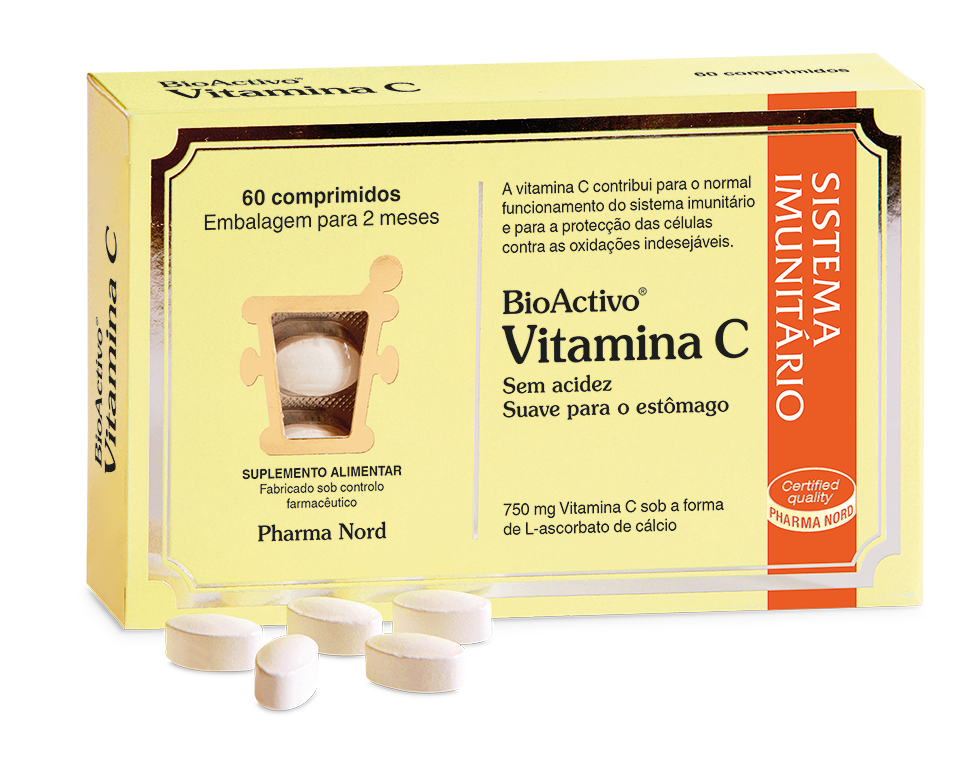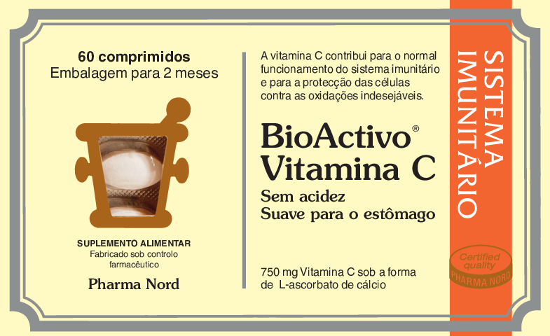 BioActivo Vitamina C contém 750 mg de vitamina C, sob a forma de L-ascorbato de cálcio que é mais suave para o estômago, uma vez que não é ácido.