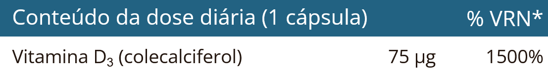 - Nova formulação com 75 µg (3000 UI) de vitamina D3 dissolvidas em azeite extraído a frio