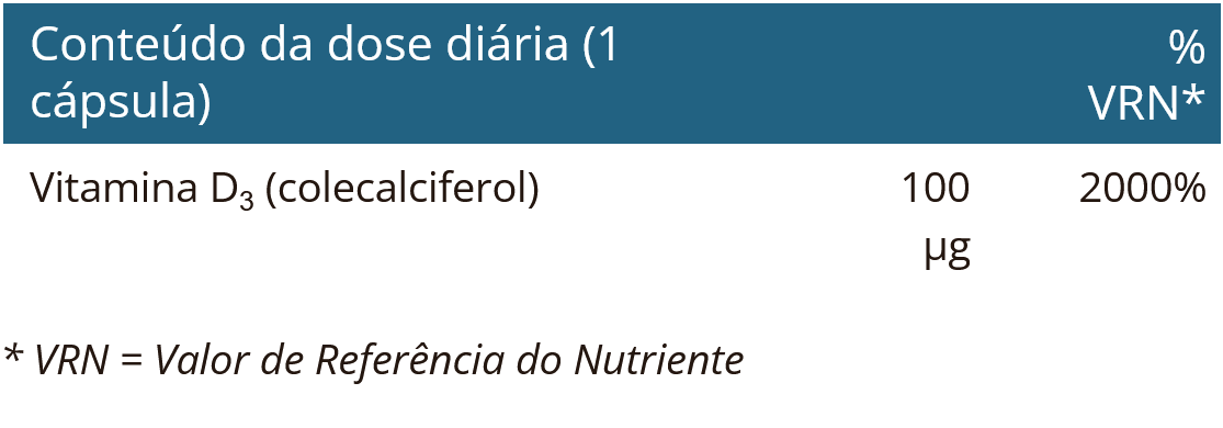 - Nova formulação com 100 µg (4000 UI) de vitamina D3 dissolvidas em azeite extraído a frio