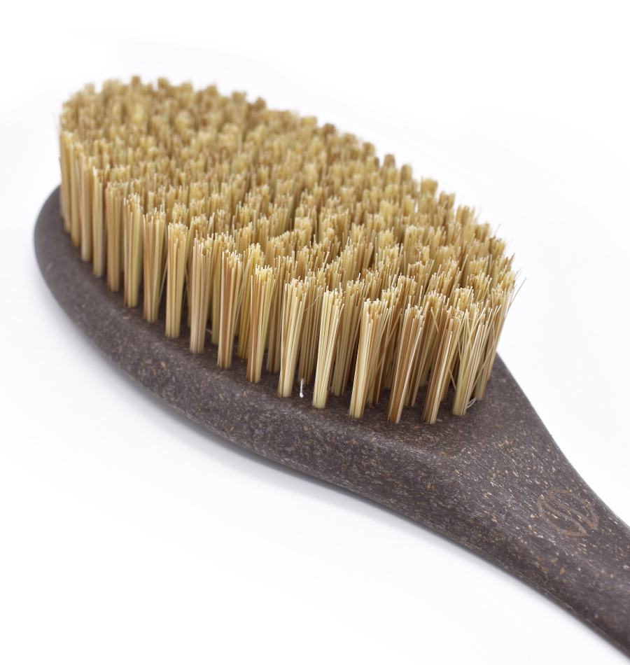 Design que permite chegar a todas as zonas do corpo para realizar uma massagem energizante e esfoliar a pele. Elimina as células mortas e desobstrui os poros. A massagem estimula o fluxo sanguíneo. Pega feita com pó de café reciclado e plástico. Cerdas sintéticas (cruelty free) adequadas para vegans. Esfoliação nível 4.